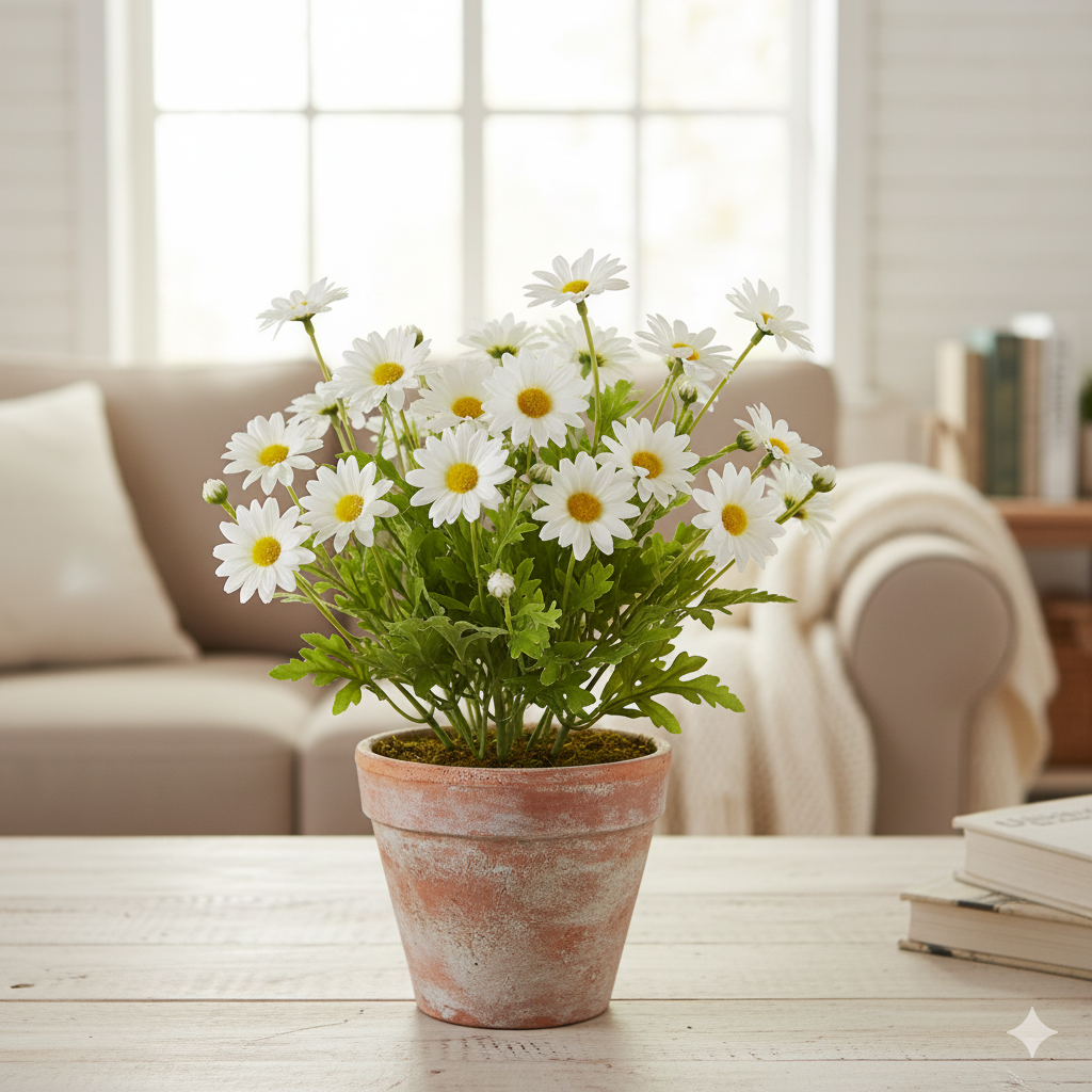 The plant features multiple lush green stems topped with clusters of classic white and yellow daisy heads. The high-quality materials ensure the petals and leaves feel realistic and hold their vibrant color throughout the year. Nestled in a simple, complementary pot, this artificial plant is the ideal, no-fuss accessory for adding a touch of rustic or cottage charm to kitchen windowsills, desks, or covered porch areas.