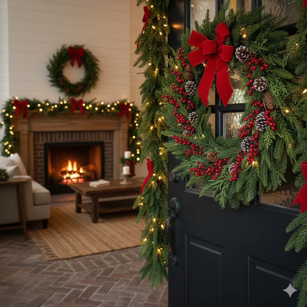 - Design: Realistic faux fir branches, natural pinecones, red berries, and velvet bows.