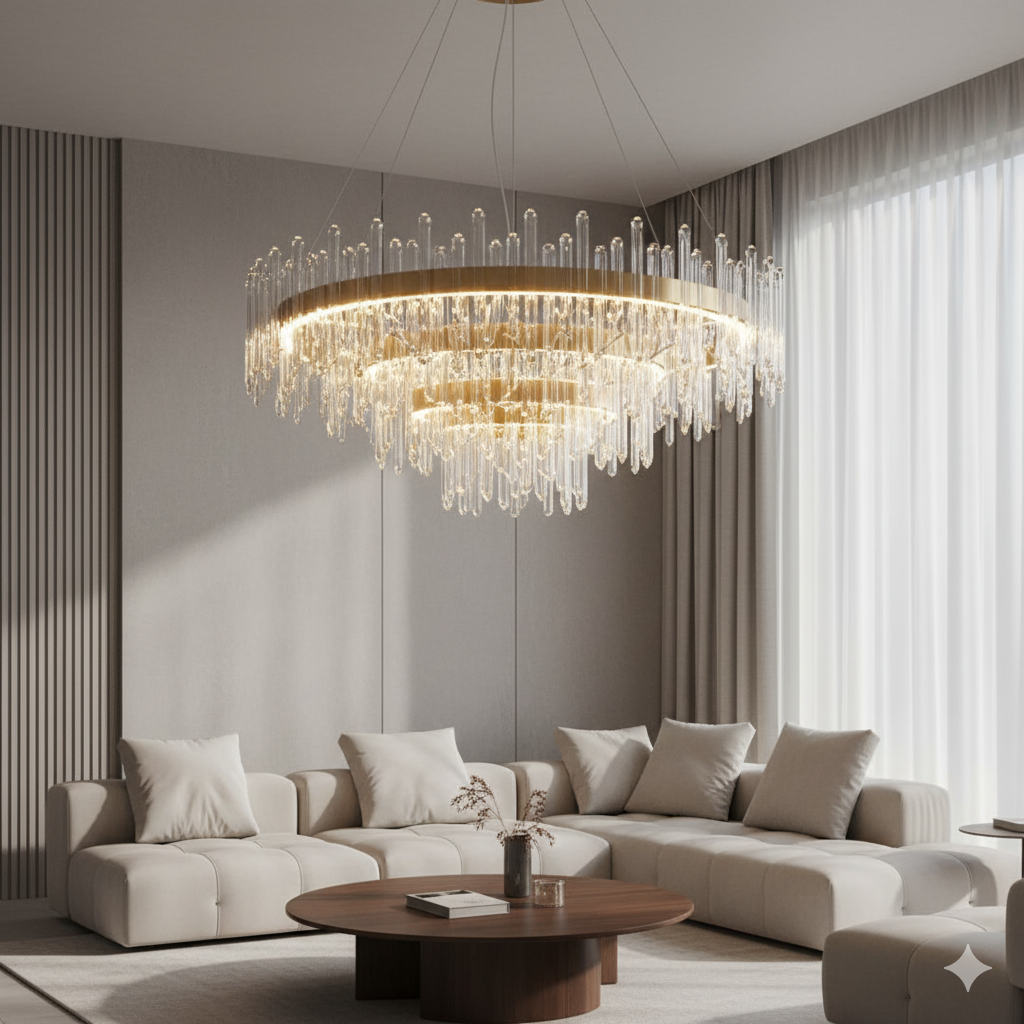 The chandelier features multiple tiers of high-quality, faceted crystal droplets meticulously arranged to catch the light and create a dramatic “rain shower” effect. The polished chrome/gold frame supports six lights, ensuring abundant illumination and making this piece a dazzling focal point of your home dΓ©cor. Its blend of classic crystal elegance and a contemporary silhouette ensures it complements both traditional and modern settings.